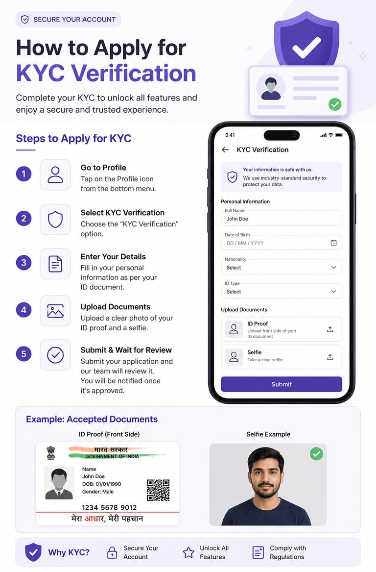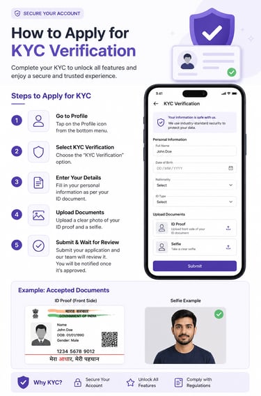 To keep your account secure and fully activated, please complete your KYC (Know Your Customer) verification by following these steps:
